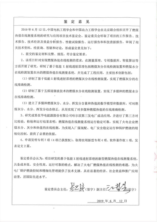 鑒定委員會(huì)認(rèn)為:項(xiàng)目研發(fā)的基于低能X射線透射原理的新型燃煤熱值在線測(cè)量系統(tǒng),具備成本低、安全性高、運(yùn)行可靠的特點(diǎn),解決了火電廠燃煤熱值在線檢測(cè)的難題,為火電廠鍋爐燃燒控制和精細(xì)化管理提供了技術(shù)支撐,具有顯著的經(jīng)濟(jì)、社會(huì)效益和推廣應(yīng)用前景,居國際先進(jìn)水平。